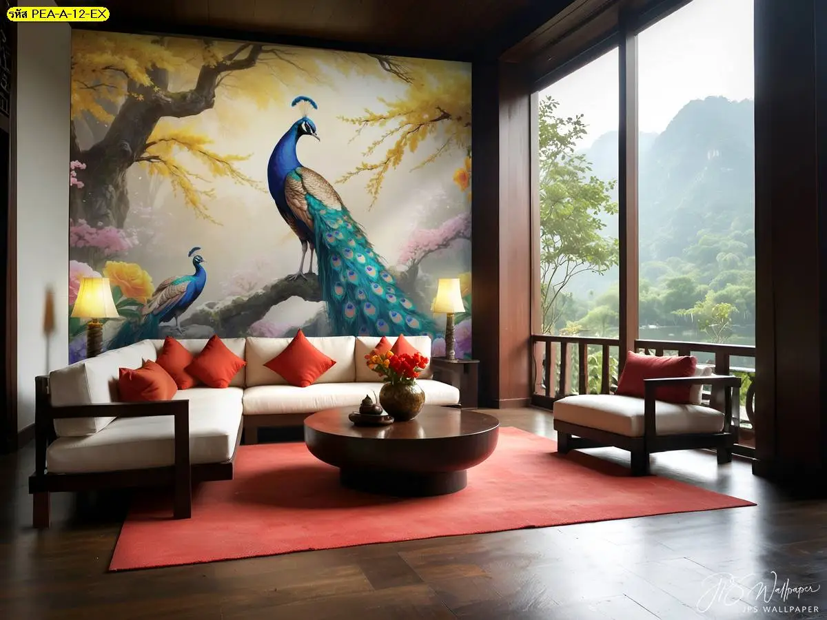 ภาพตกแต่งผนังลายนกยูงแบบมีพลังงานบวก วอลเปเปอร์ตกแต่งผนังห้องนอนลายนกยูง ภาพนกยูงติดผนังสไตล์ญี่ปุ่นผสมไทย